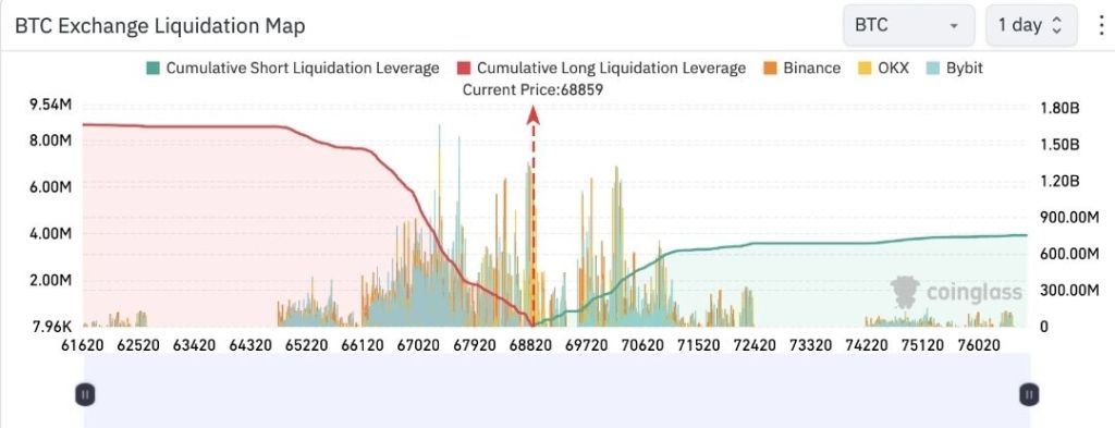 If Bitcoin’s price rises to $70,000, approximately $174.17 million will be liquidated, as per CoinGlass data.