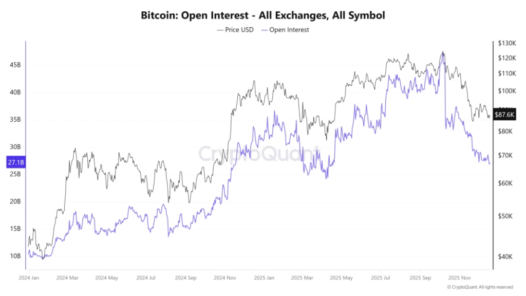 This price movement coincided with substantial expansion in futures market positioning, with open interest nearly doubling during Q4 after remaining relatively stable throughout most of the year. Despite this, follow-through proved limited.